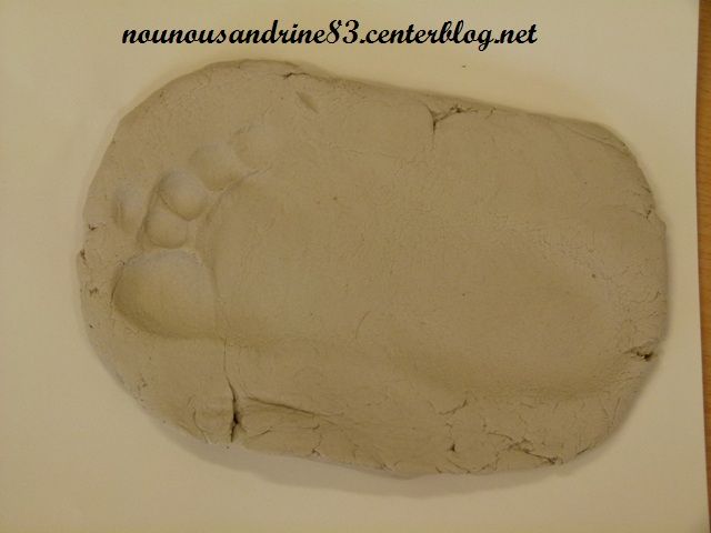 c'est une sorte de pate à sel qui durci en moins de 24 heures, je fais une galette puis l'enfant marche dessus et appuie très fort, tout simplementhttp://nounousandrine83.centerblog.net